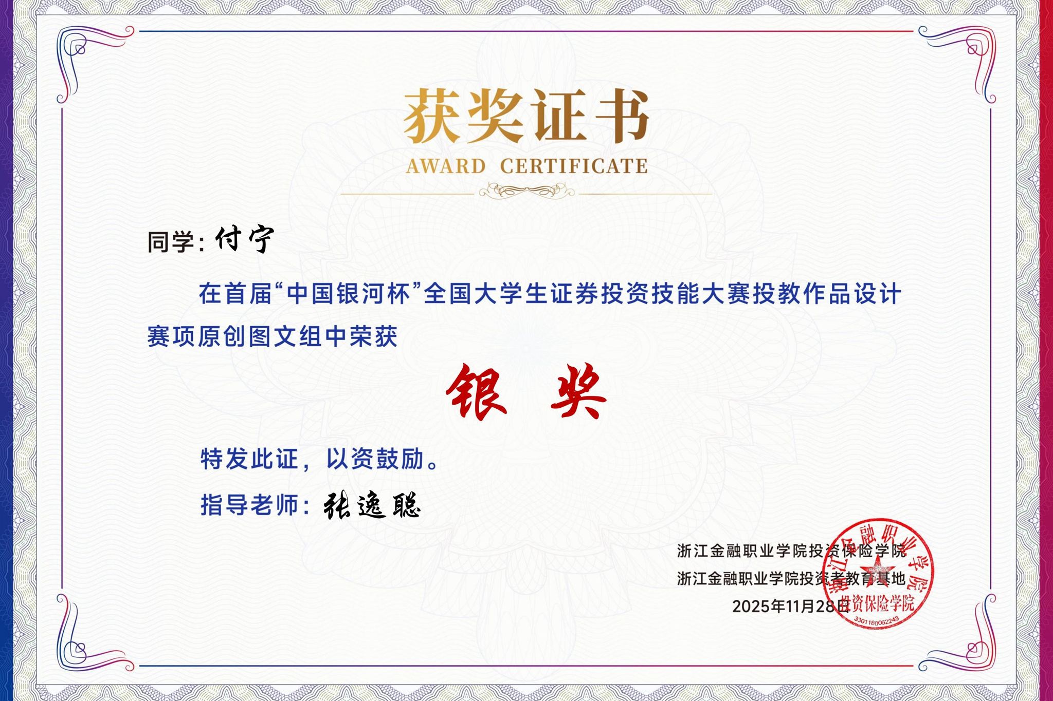 12月15日,2025年“中国银河杯”全国大学生证券投资技能大赛颁发获奖证书。我校由张逸聪老师带领的14名学生在投教作品设计赛项中表现卓越,以原创视频组和原创图文组双赛道齐发,共获2个银奖、12个铜奖。